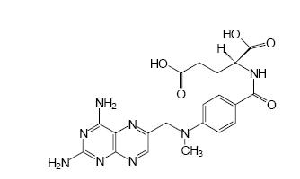 4.大剂量治疗:大剂量甲氨蝶呤单独应用或与其它化疗药物联合应用治疗 下列肿瘤:成骨肉瘤、急性白血病、支气管肺癌或头颈部表皮癌。大剂量甲氨蝶呤应用时, 必须应用亚叶酸进行解救。亚叶酸是四氢叶酸酯的衍生物,可与甲氨蝶呤竞争进入细胞内。这种“亚叶酸解救”可在大剂量甲氨蝶呤应用时保护正常组织细胞免受损害。