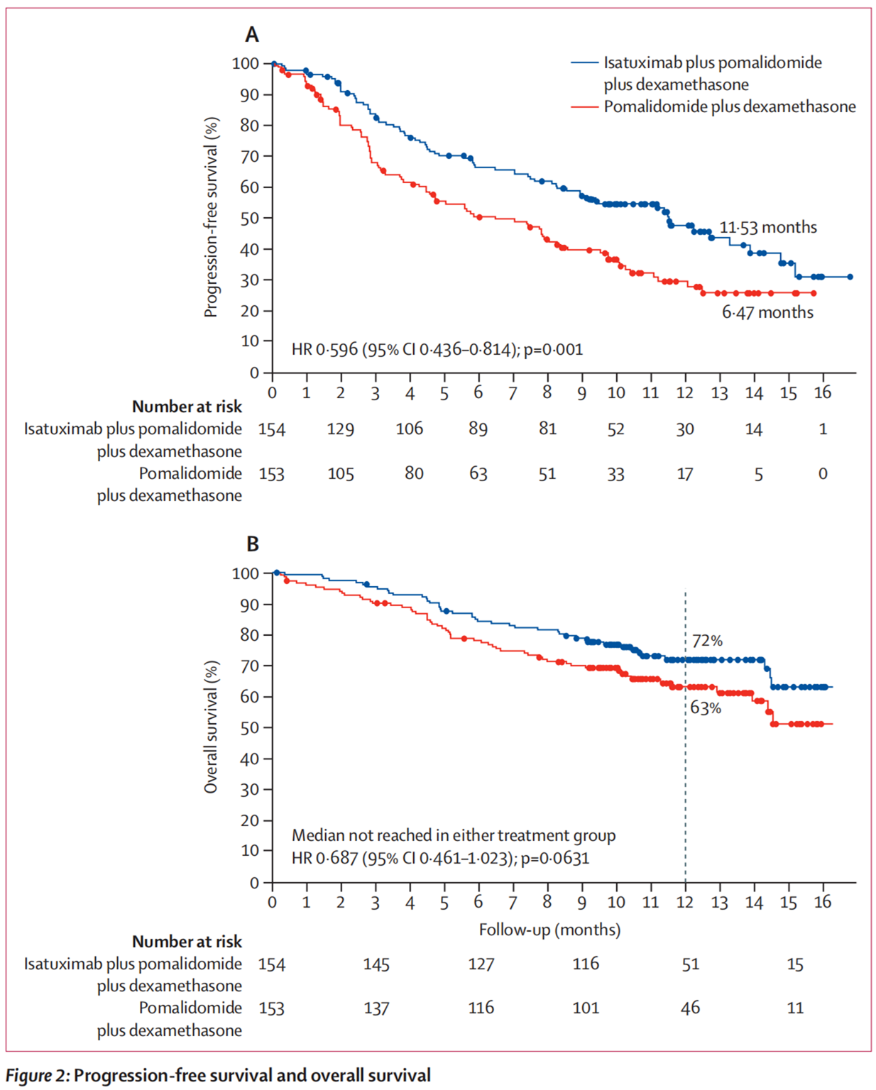 主要疗效指标是由独立委员会使用国际骨髓瘤工作组(IMWG)标准,根据M蛋白的中央实验室数据和放射影像学检查结果评估的无进展生存期(PFS)。中位随访时间为11.6个月,Isa-Pd治疗组的总缓解率为60.4%,而Pd治疗组为35.3%。Isa-Pd治疗组的中位PFS为11.53个月(95%CI: 8.94-13.9),而Pd治疗组为6.47个月(95%CI: 4.47-8.28)。PFS的改善意味着接受Isa-Pd治疗的患者疾病进展或死亡的风险降低了40%(HR=0.596; 95%CI: 0.44-0.81; p=0.0010)。