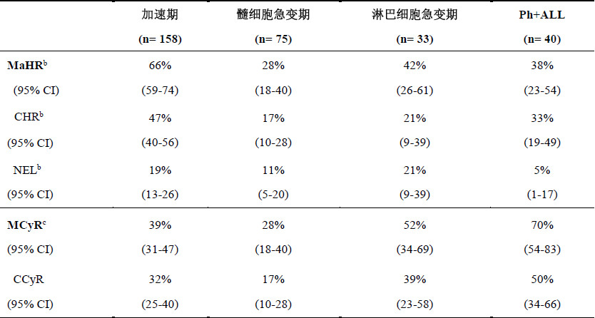 在接受140mg、每天1次方案治疗的急粒变CML患者中,中位MaHR持续时间为8个月;中位PFS为4个月;中位总体生存期为8个月。在接受140mg、每天1次方案治疗的急淋变CML患者中,中位的MaHR持续时间为5个月;中位PFS为5个月,中位总体生存期为11个月。在接受140mg、每天1次方案治疗的Ph+ ALL患者,中位的MaHR持续时间为5个月;中位PFS为4个月,中位总体生存期为7个月。
