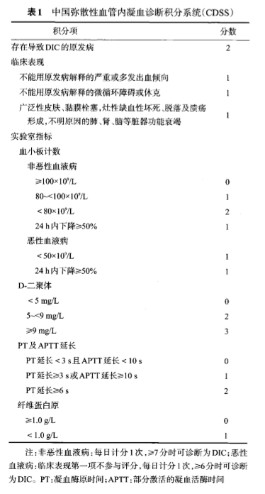 重症患者出凝血功能异常往往导致患者死亡,因此早期动态监测、早发现、早预防尤为关键,中华医学会血液学分会血栓与止血学组于2014年起通过多中心、大样本的回顾性与前瞻性研究,建立了CDSS评分系统(表1)。现已有文献证实6应用CDSS积分系统能够早期识别新型冠状病毒肺炎合并DIC,并与DIC的严重程度有相关性7。